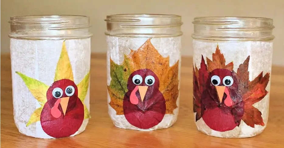 - Glue flattened leaf onto jar (it will act as the turkey tail feathers)